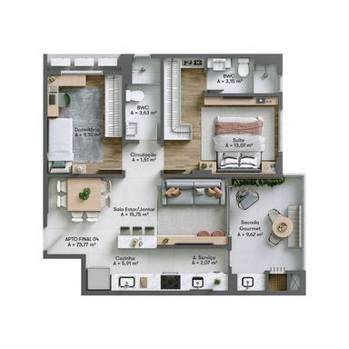 Unidade de 2 dormitórios, sendo 1 suíte, banheiro social com espaço para uma banheira, amplo conceito aberto com sala, sala de jantar e cozinha. Área de serviço e sacada gourmet com churrasqueira.