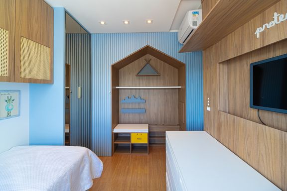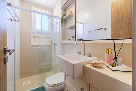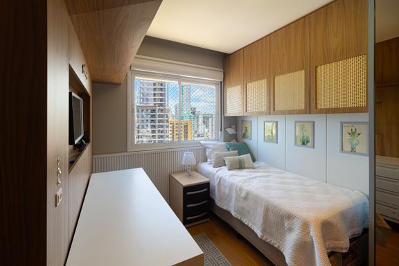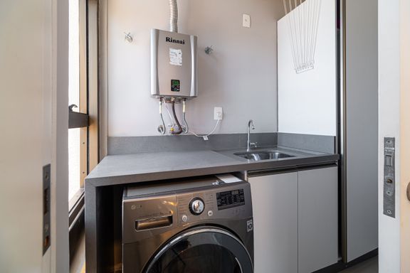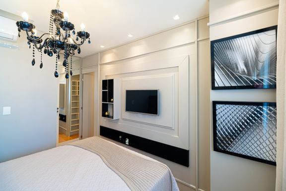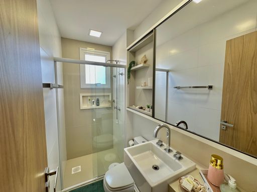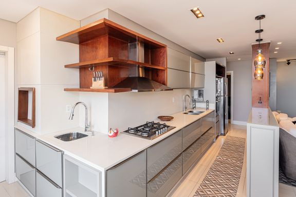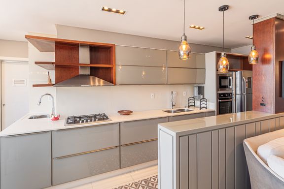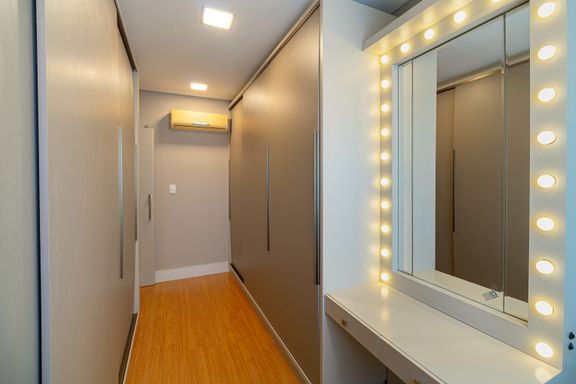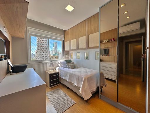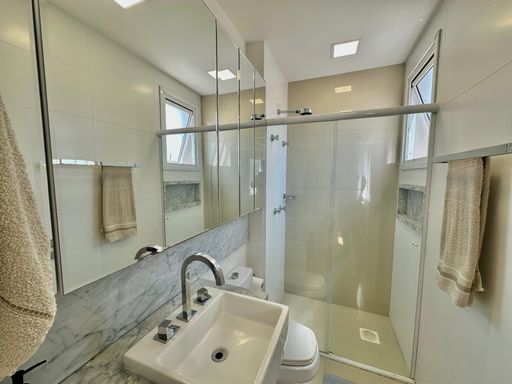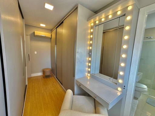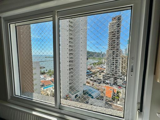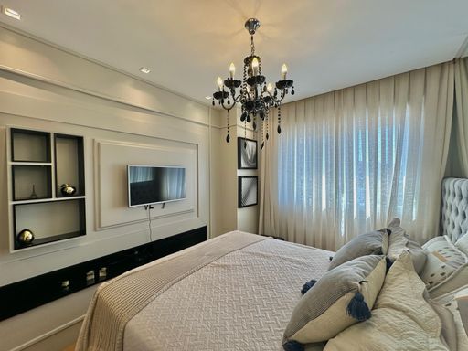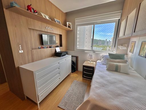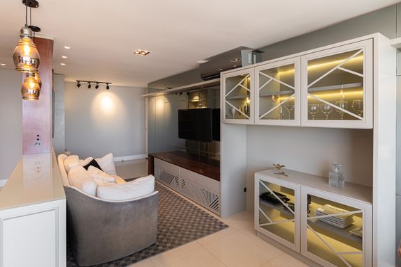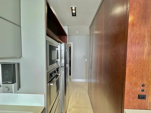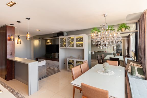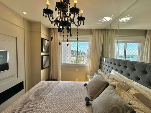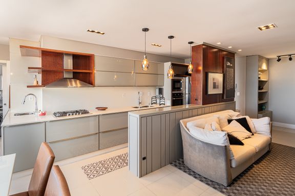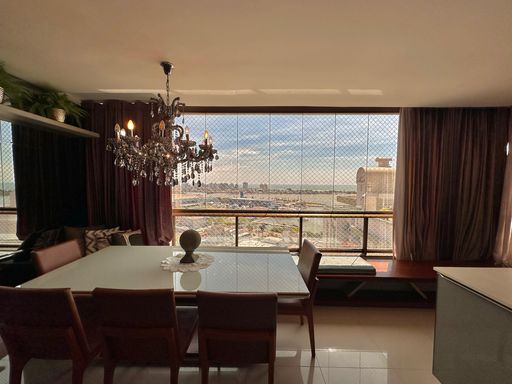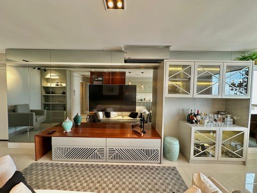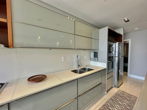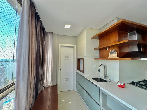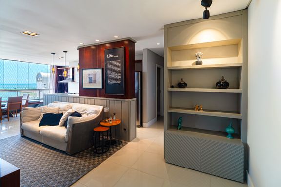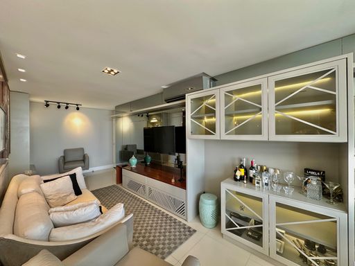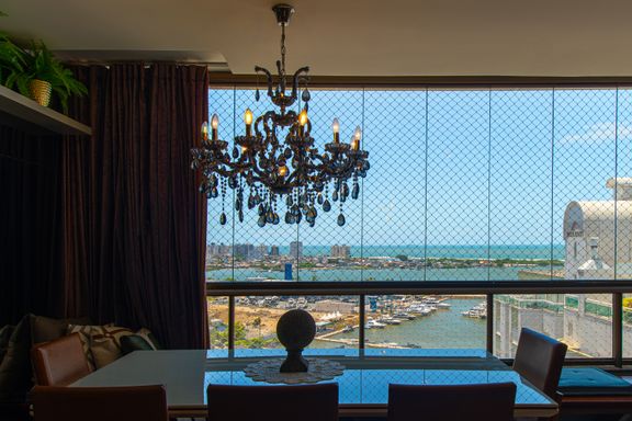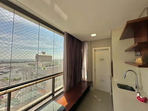 Apartamento de 98m² está mobiliado, equipado e decorado. Área íntima conta com duas suítes sendo uma com closet, lavabo, varanda integrada com churrasqueira e vista para mar e rio, living amplo com ambientes integrados, cozinha e área de serviço.