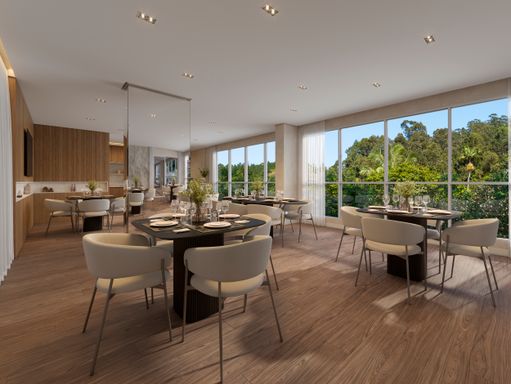 Empreendimento torre única com 6 apartamentos por andar e plantas espaçosas com opções vista mar ou vista montanha.