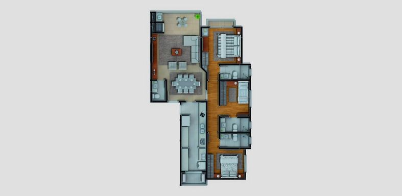São 3 suítes sendo uma com balcão externo, persianas automatizadas, sala para 3 ambientes sendo: espaço gourmet com churrasqueira a carvão, sala de estar e sala de jantar, lavabo, ampla cozinha e área de serviço.
