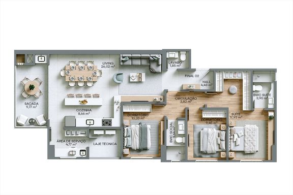 A tipologia desse apartamento conta vestíbulo na entrada, três dormitórios, sendo uma suíte com closet, banheiro social, lavabo, uma ampla área social para dois ambientes, cozinha em conceito aberto integrada com living, área de serviço separada e varanda com churrasqueira.