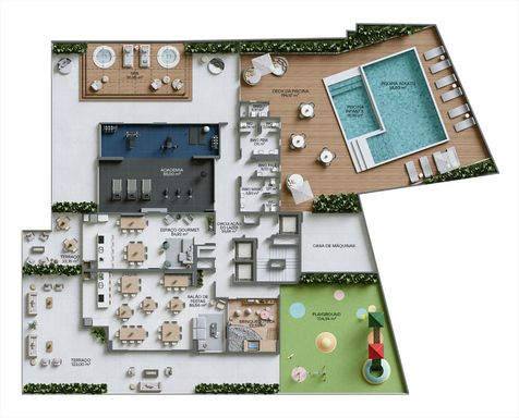 A infraestrutura do Residencial Monte Viso entrega um hall de entrada, spa, deck com piscina infantil e adulto, academia, espaço gourmet, salão de festas, playground e um amplo terraço.